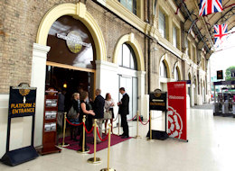 The exterior of the famous British Pullman train Check in for your journey on a red-carpeted platform Step on board and enter the 1920s Sparkling drinks for every guest A four-person band at the Whistable platform
